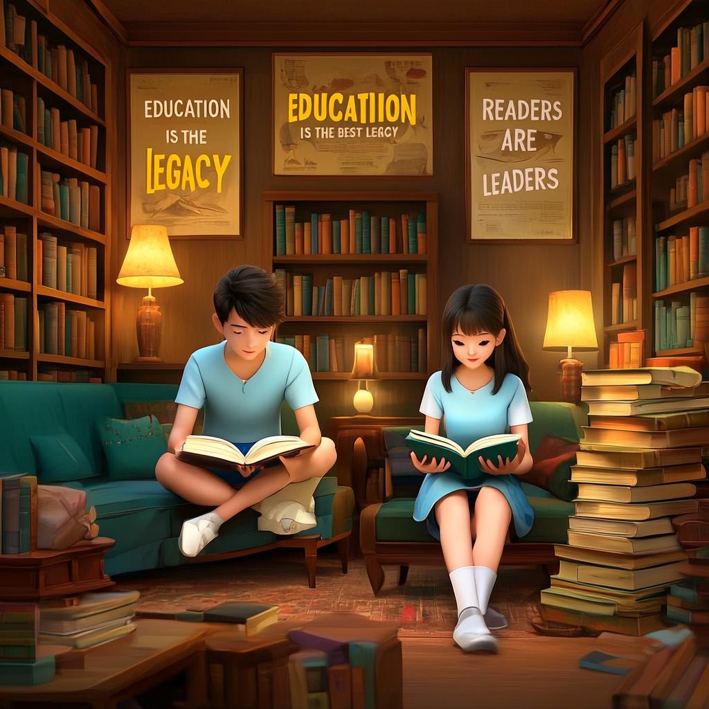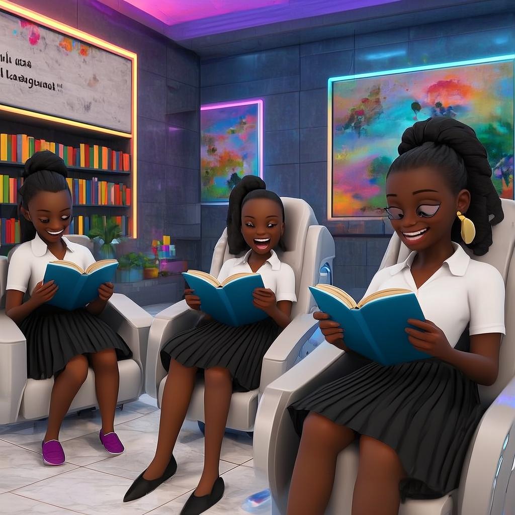 a serene environment with massaging (cozy) chairs and snacks. The environment has neon light, futuristic shelves with books of different colours and types. There should be a marble tiled floor and paintings of encouragement with titles such as "Education is the sword that fights ignorance" fitted on the wall. Three African girls on uniforms (black pleated short skirt and white ironed shirt black tie and white long socks with black shoe) reading books excitedly on the massage chair. 2K resolution and 3D animation.