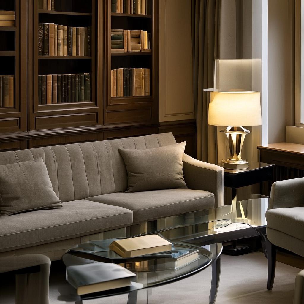 Professional reading room with very conducive atmosphere, cozy sofa, fitting walls, bright table lamp, library of book in glass table with shelves.