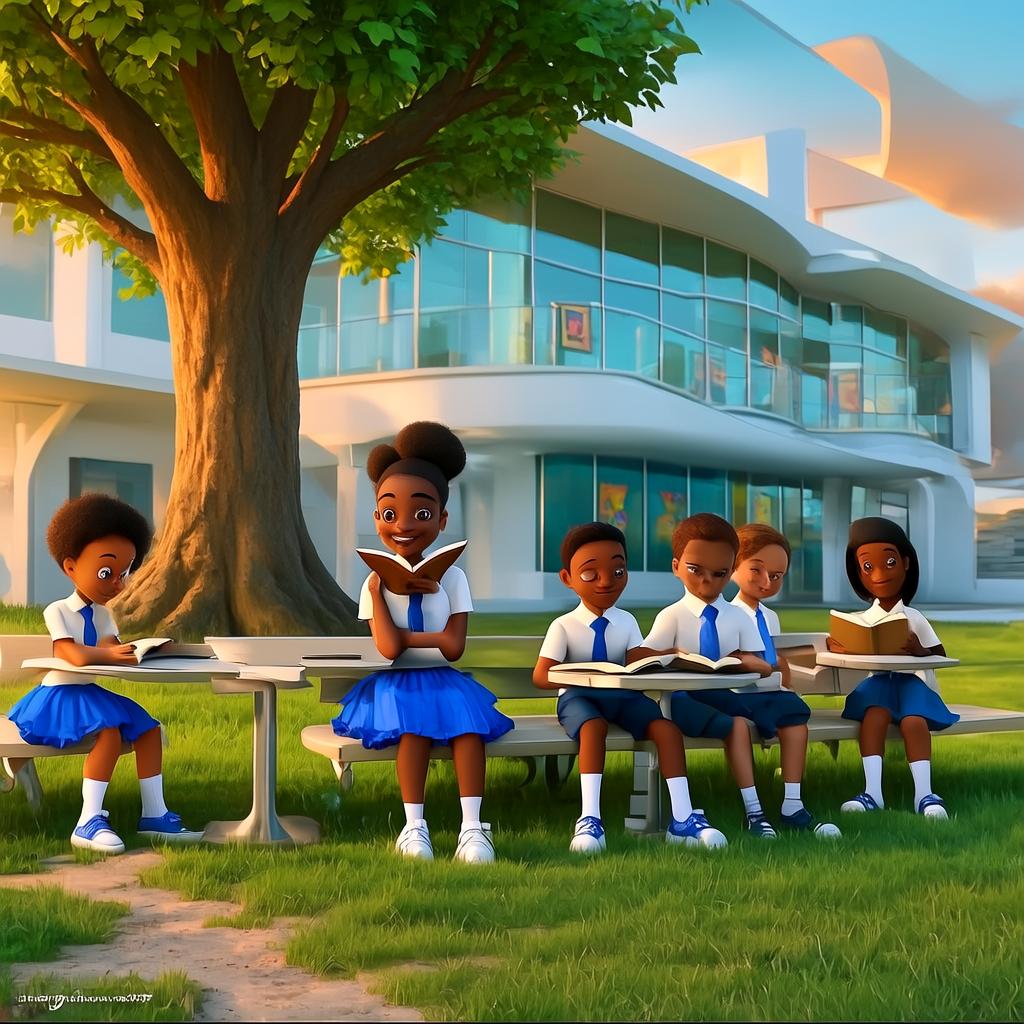 create an environment that is conducive for reading and studying for high school students with a big green tree as a shade in a naturalistic environment with 5 glass benches and tables that can sit 3 to 4 people, with a sunset and a cooling breeze with books placed on the table and the floor covered with carpet grass that is suitable for reading with an African girl and an American girl (teenagers) under the tree reading and 5 African boys and American boys and girls each sitting on a glass bench reading and talking in which the girls are wearing a blue ruffle skirt above the knee
