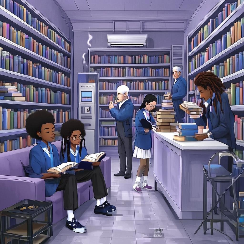 a big hall filled with different types of books on platinum shelves, there should be couches, Air conditioner, snack and water machine with a neutral lilac and some students with joy dressed in blue and white reading books an afro headed girl, an albino with braided hair, a boy with low cut) a librarian checking in books, a man with dreadlocks smoking pipe stacking books on the shelves.