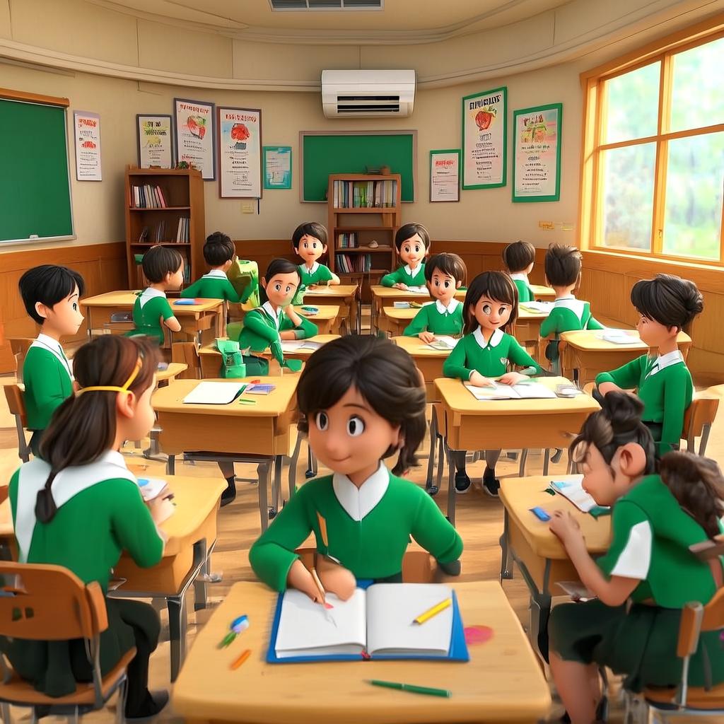 An image which has notebooks (as the wall background and air conditioner table and chair at each place in a round format with a pen, pencil, eraser, ruler, and other stationary materials on each table with a book shelf with a Pixar grade 3D animation ultra HD 2K resolution and different encouraging posters with students in a green and white uniforms at the age of ten to fifteen.