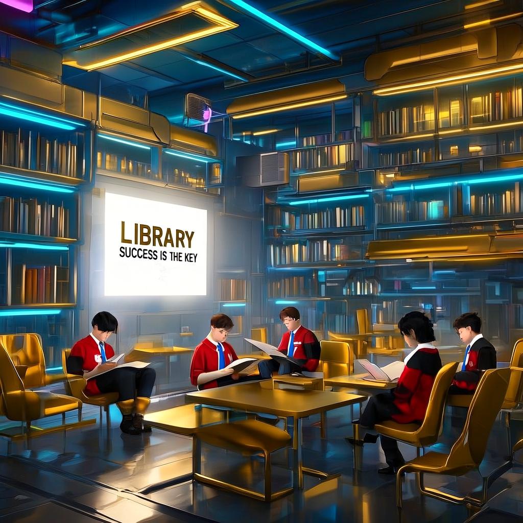 Create an image of a futuristic library with futuristic tubes that carries interesting books to the glass shelves with neon light. Golden chairs and tables, air conditioner, golden lights and 2K resolution with students sitting and reading (red, white and black uniforms with blue tie) and futuristic projector. A poster written on it LIBRARY, and a saying SUCCESS IS THE KEY