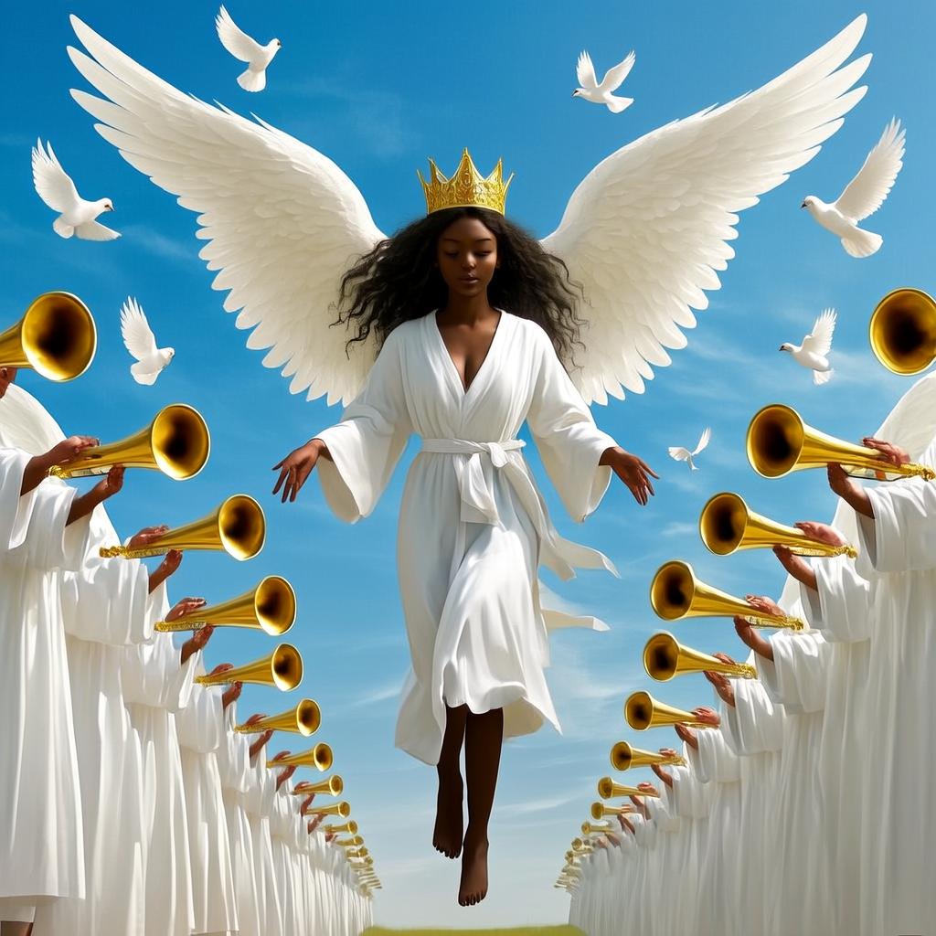 A good cloud in heaven, six golden trumpets by the left and right with six white coloured angels wearing white robe with a white wing and a golden crown each on their head. Then, in the middle, a beautiful dark-skinned girl with a white robe and a white wing and a golden crown descending to the ground with doves flying in the sky with ultra HD and 2k resolution.