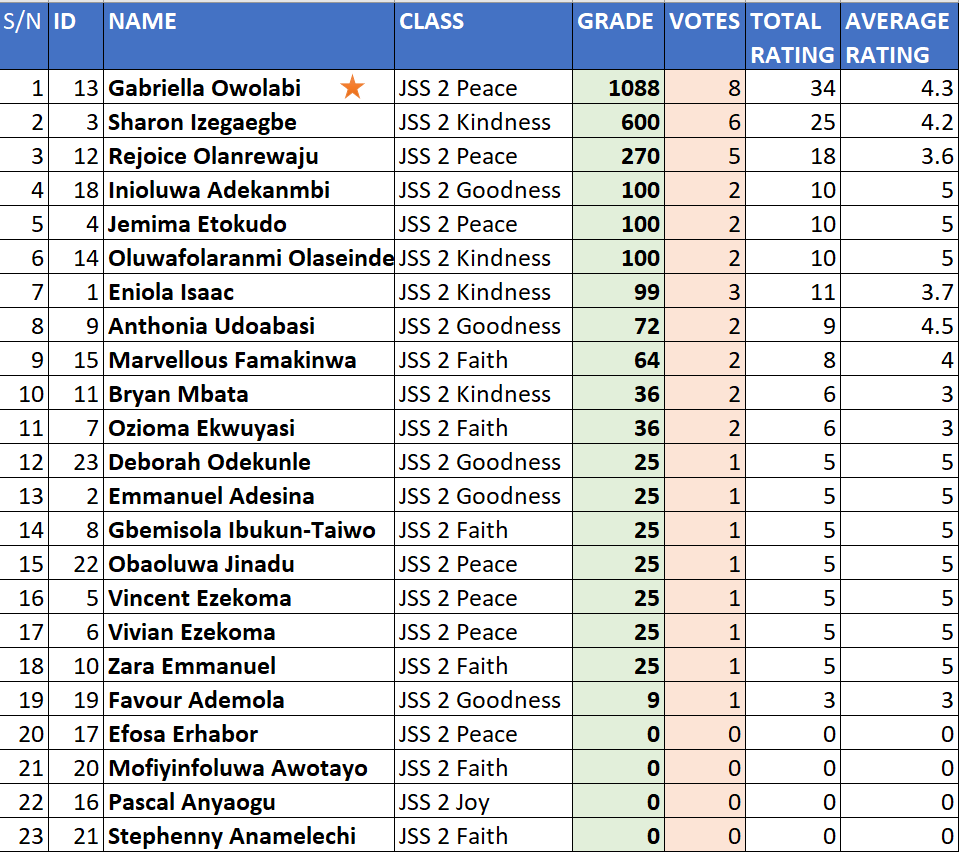 OWOLABI GABRIELLA (JS2 PEACE) won the junior category with 1088 points.